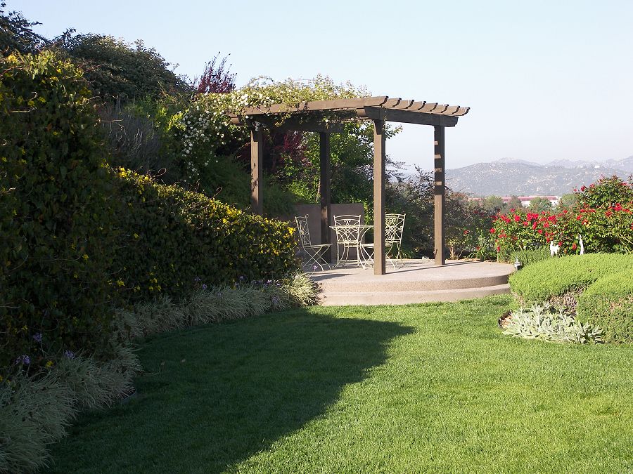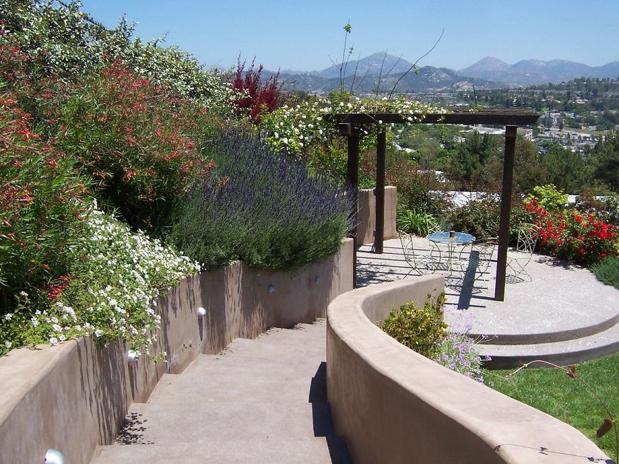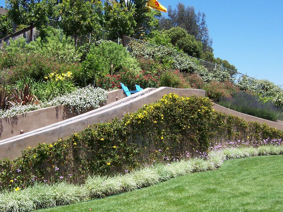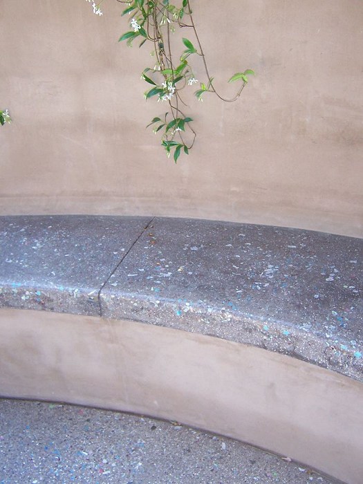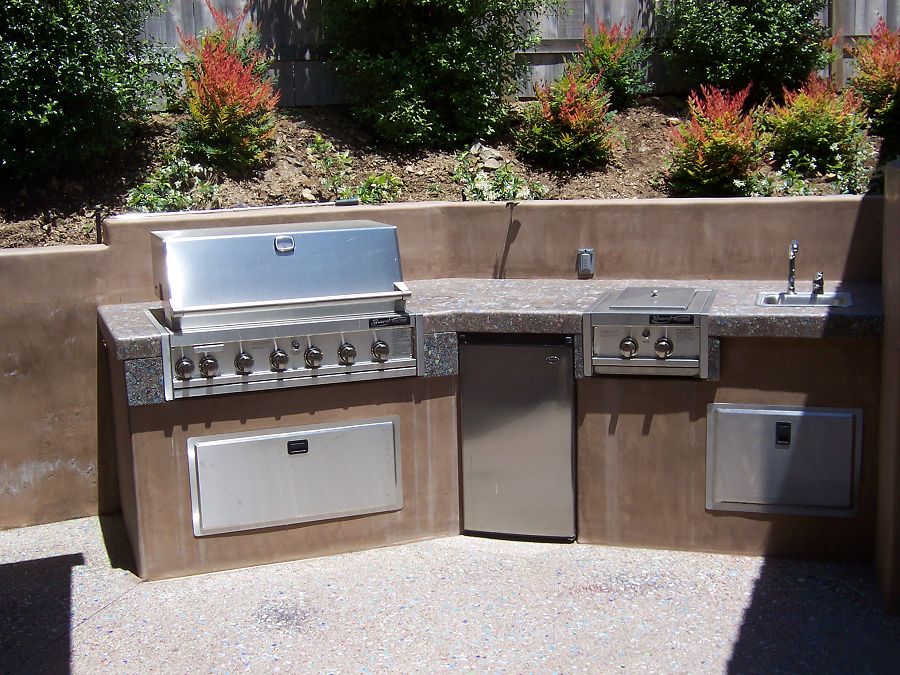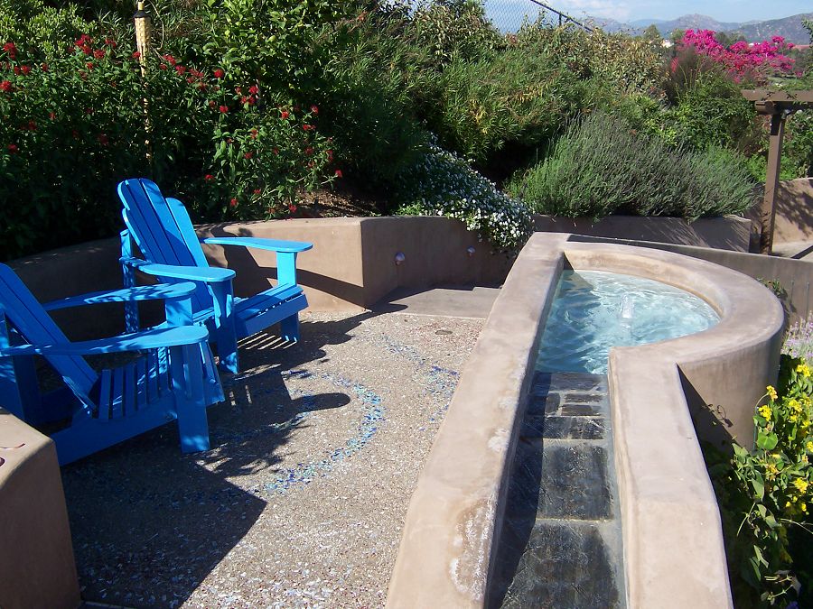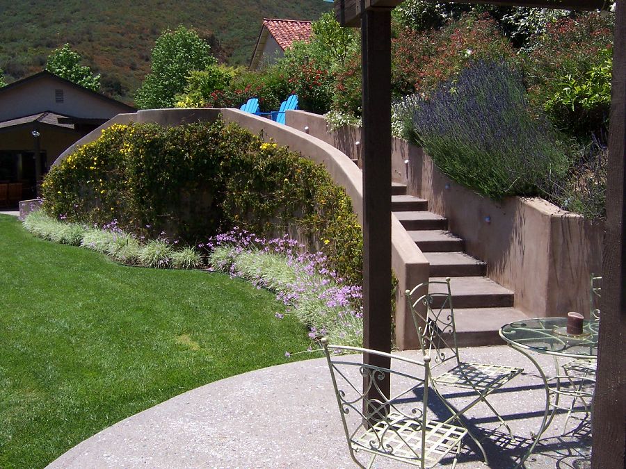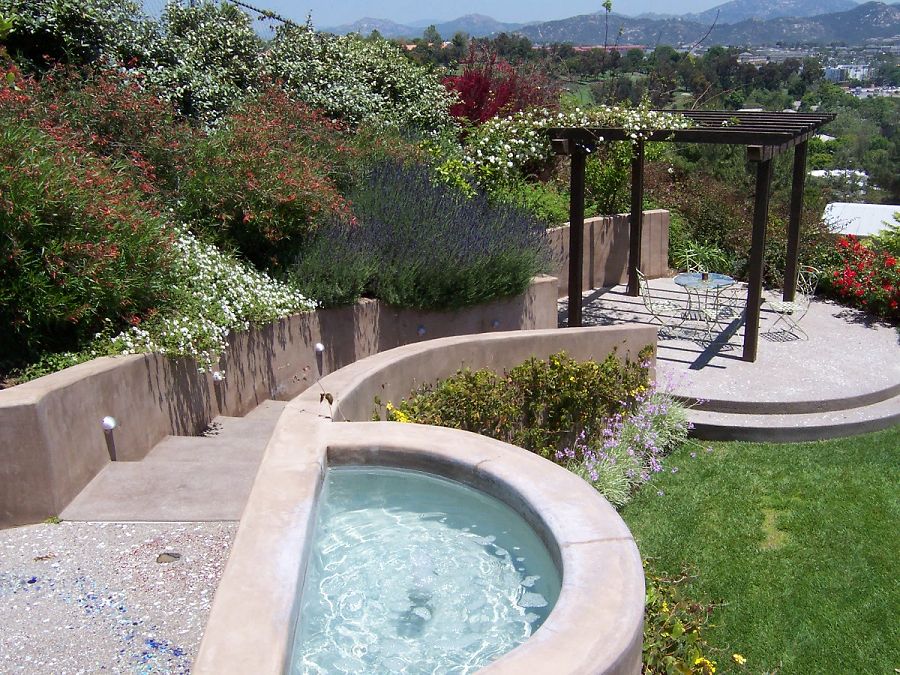 Klemaske Residence -- Design for a retaining wall in a suburban back yard. Water feature, paving and countertops designed to showcase the client’s business of decorative concrete and masonry contracting.