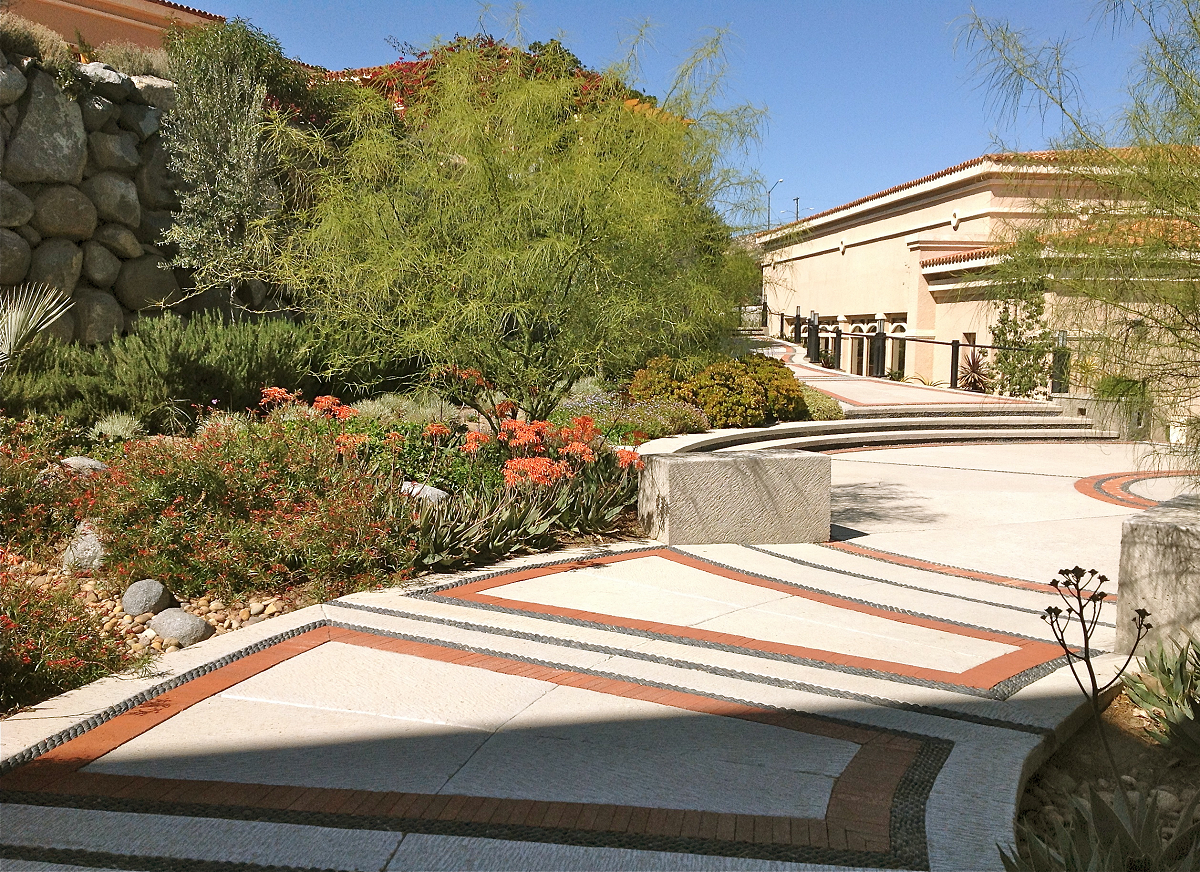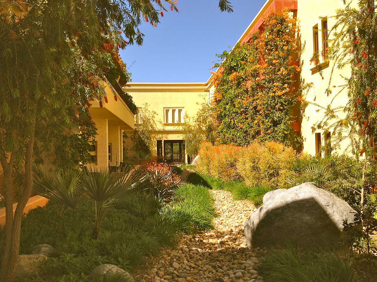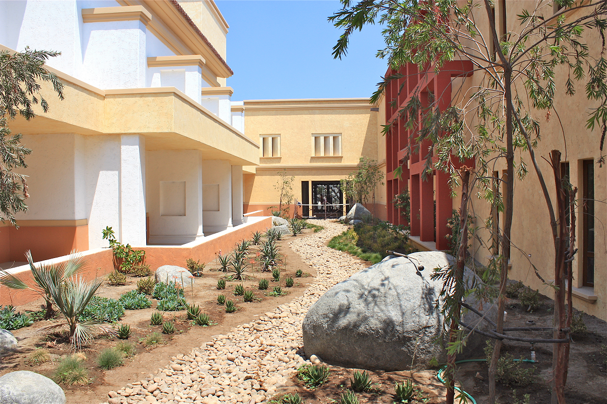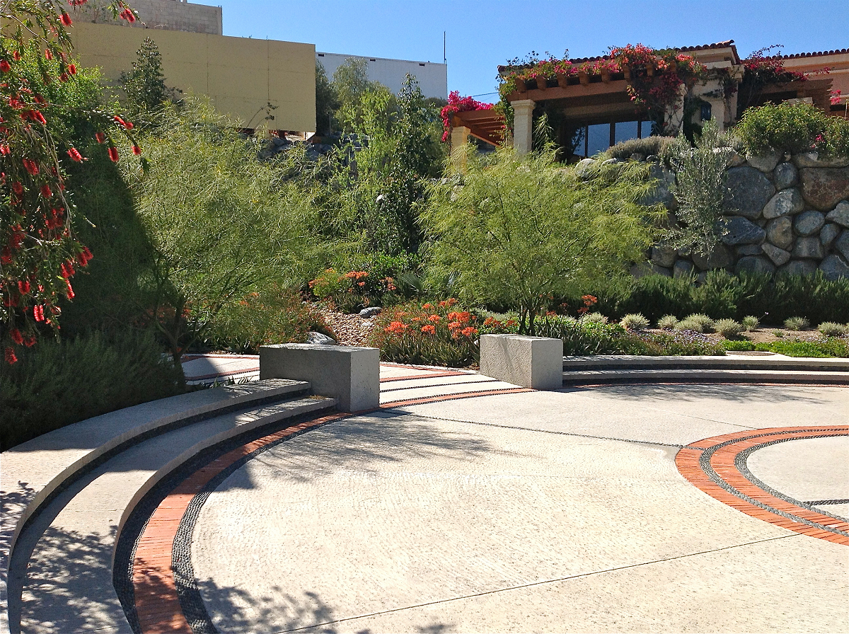 Santuario Hotel -- A small boutique hotel catering to businessmen, close to the U.S. Border crossing, that is part of a complex that includes a high end restaurant and banquet facilities. Project scope included hardscape and planting design for a circulation plaza, Hotel entry, and interior courtyard. Several enormous boulders left on site from construction were incorporated into the gardens, in addition to many stonework features.